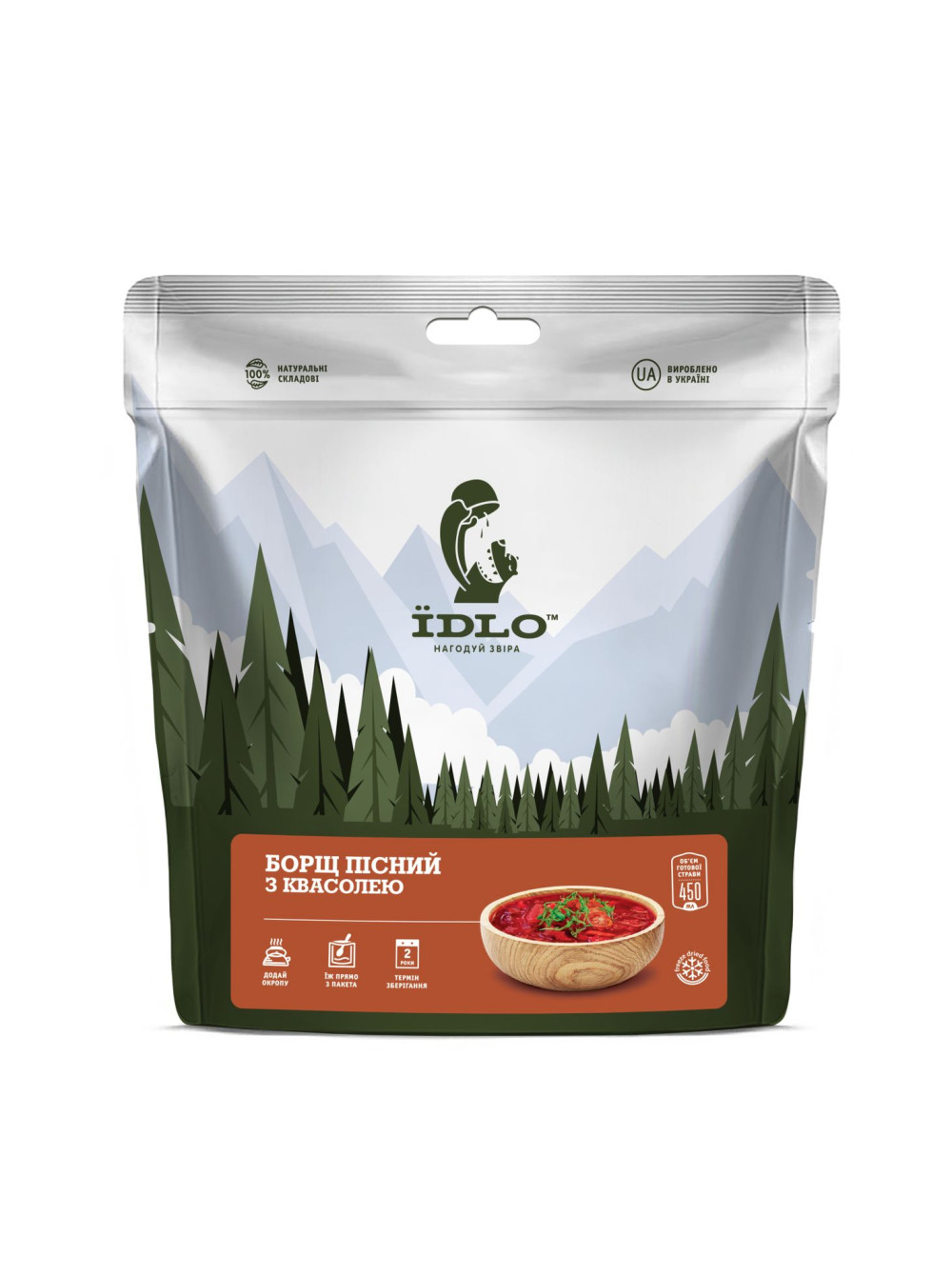 Склад: квасоля варена сублімована, овочі тушковані сублімовані (буряк, капуста, морква, цибуля,томатна паста, петрушка), картопляні пластівці, томатні пластівці, цукор, сіль, часник сушений. Виготовлено методом сублімації та інфрачервоної сушки натуральних інгредієнтів.