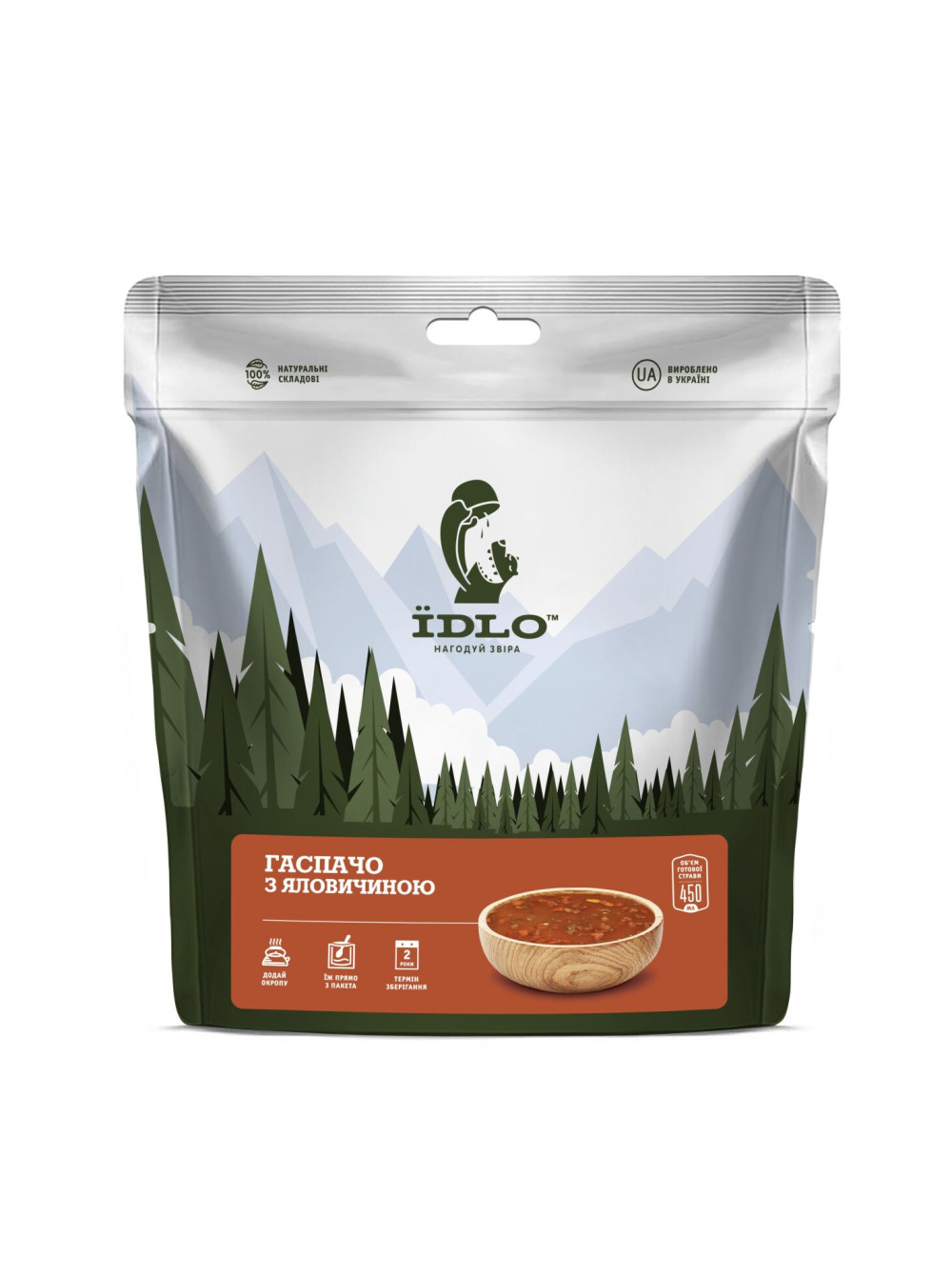 Метод приготування: струсити та відкрити пакет, дістати поглинач, залити страву окропом 450 мл (до рівня 8,5 на лінійці справа), ретельно перемішати, закрити замок на пакеті та зачекати протягом 10 хвилин, насолоджуватися стравою. Не панікувати, якщо “пощастило” спробувати поглинач на смак, це абсолютно безпечно.