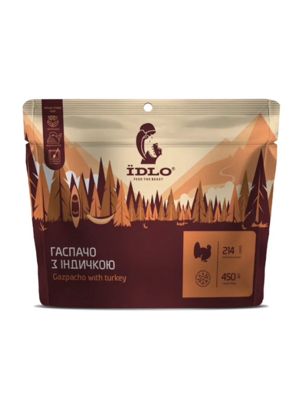 Склад: нутове пюре сушене (70%), індиче філе варене сублімоване (17%), петрушка сублімована, томат сушений, паприка червона сушена, цибуля сушена, мускатний горіх, коріандр, часник сушений, перець чилі, сіль.