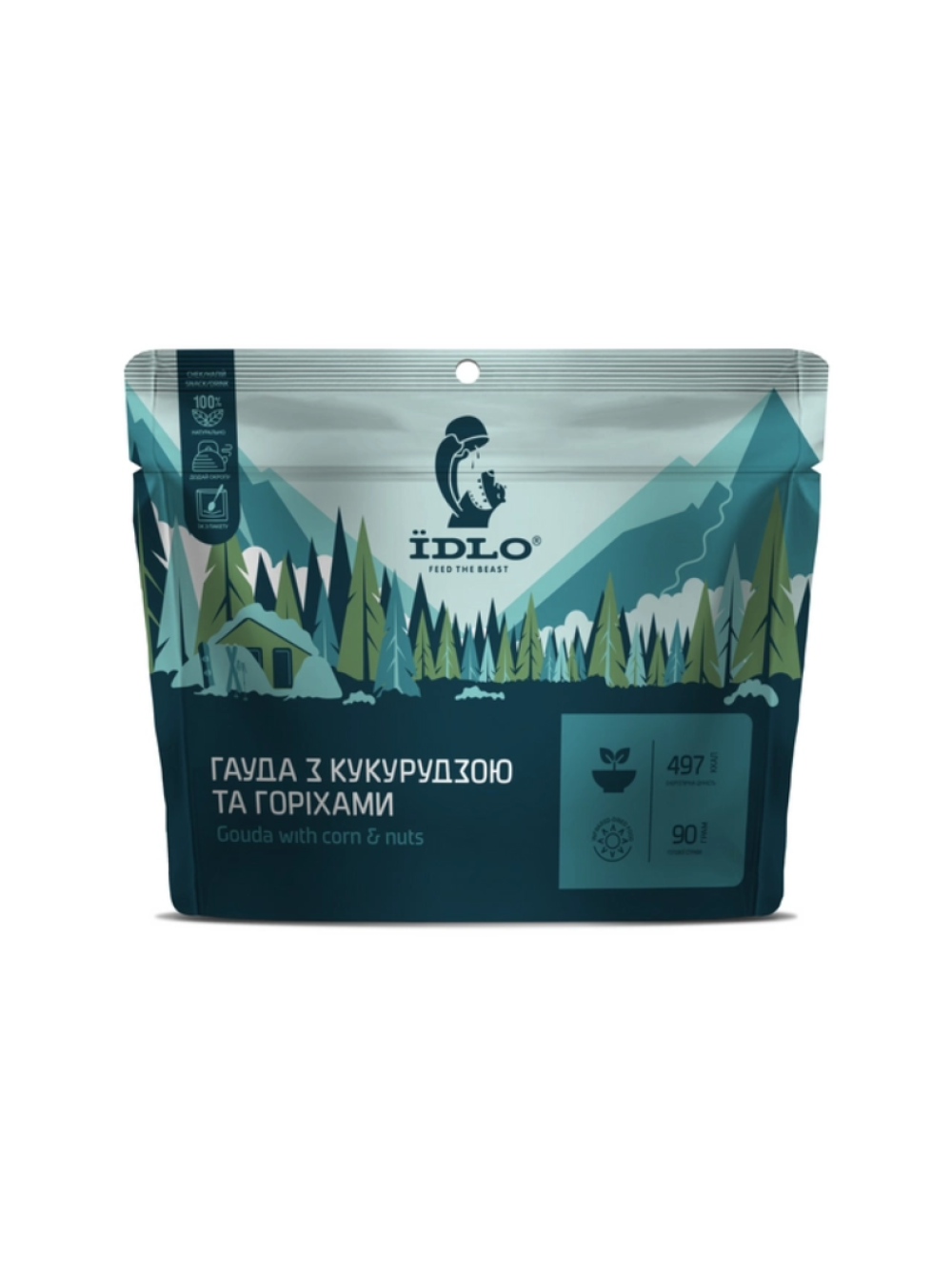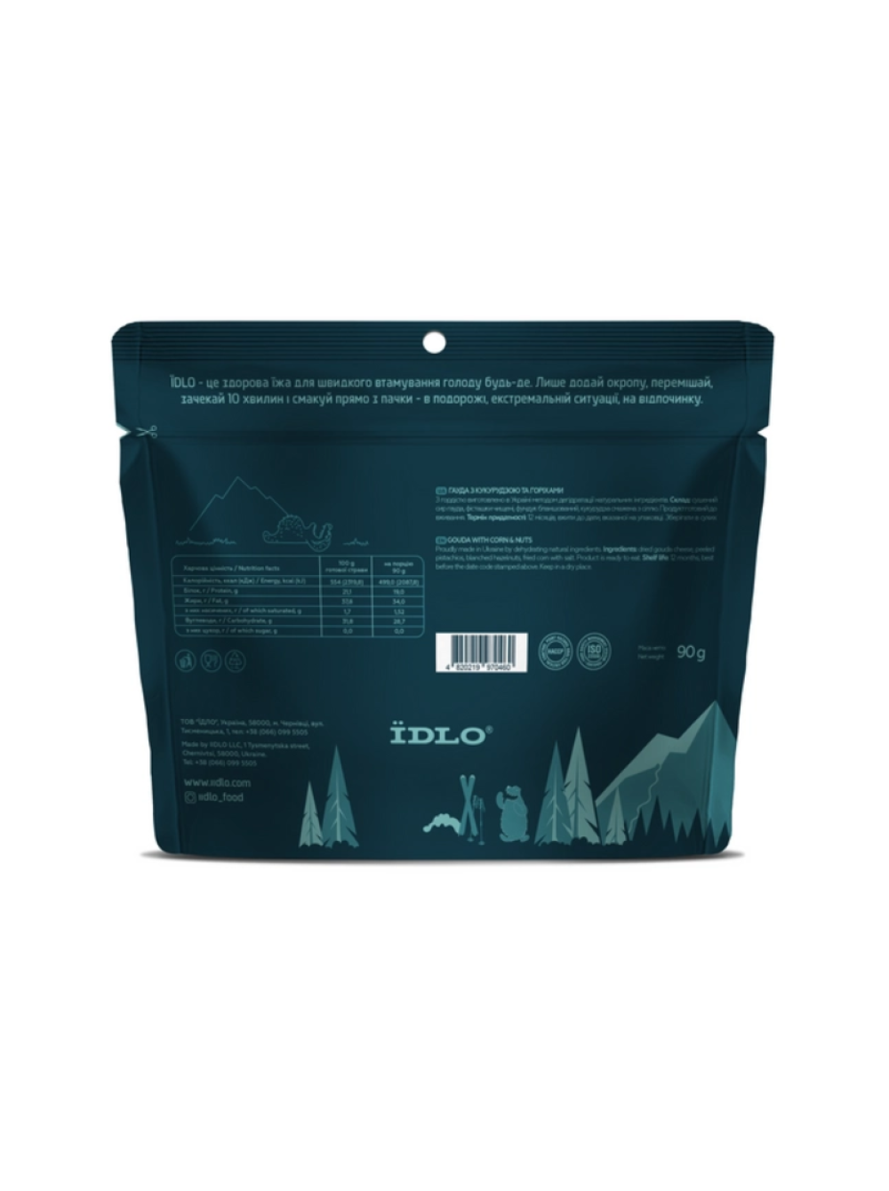 Склад: сушений сир гауда, фісташки чищені, фундук бланширований, кукурудза смажена з сіллю. Виготовлено з натуральних продуктів без використання консервантів, штучних складників та цукру. Продукт готовий до вживання.