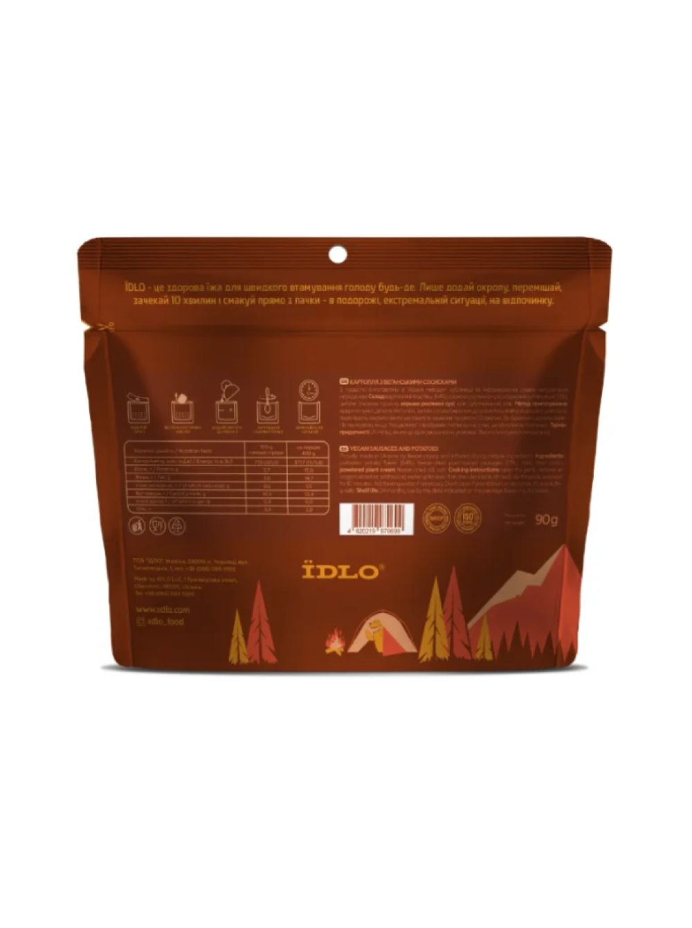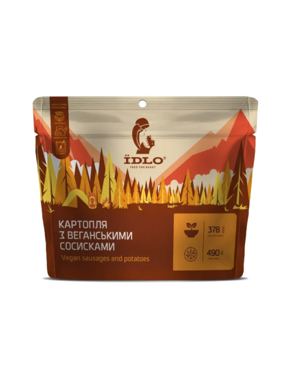 Склад: картопляні пластівці (64%), сосиски рослинні сублімовані (13%) (білок гороховий, олія соняшникова,крохмаль картопляний, цитрусові волокна, карагенан, екстракт дріжджів, цибуля, селера, сіль), цибуля смажена сушена, вершки рослинні сухі, кріп сублімований, сіль.