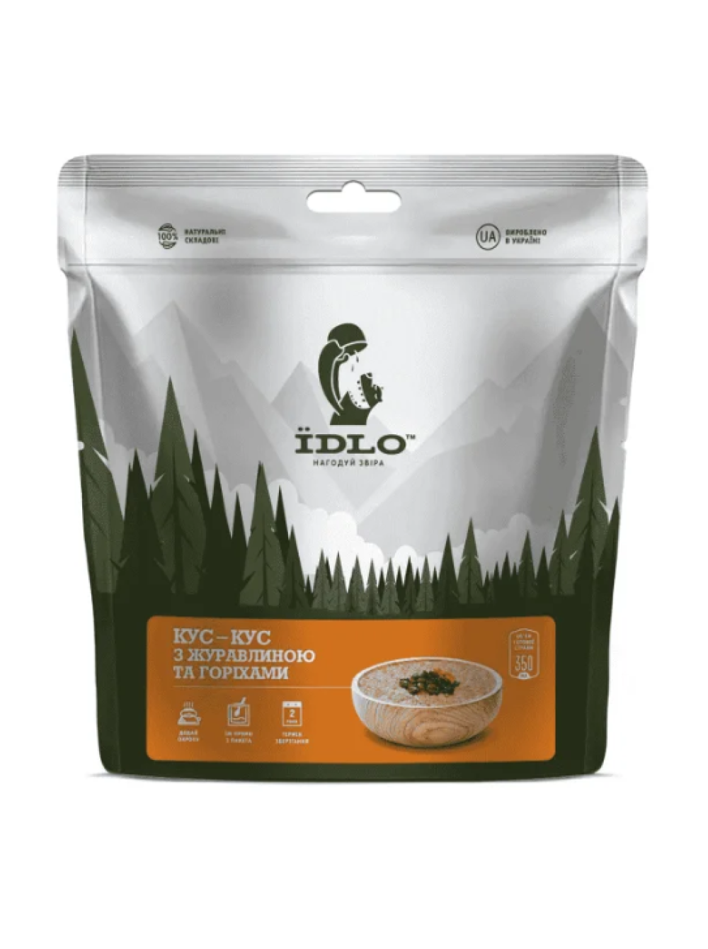 Склад: кус-кус (борошно твердих сортів пшениці, вода), журавлина сушена, горіх волоський, сухі вершки. Виготовлено методом інфрачервоної сушки натуральних інгредієнтів.
