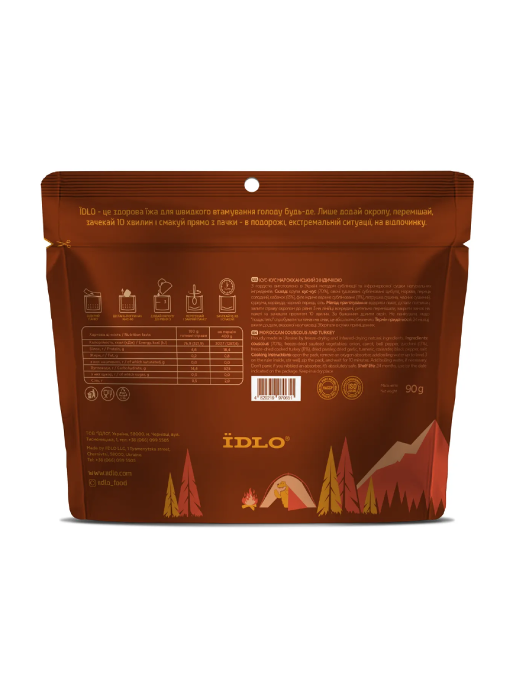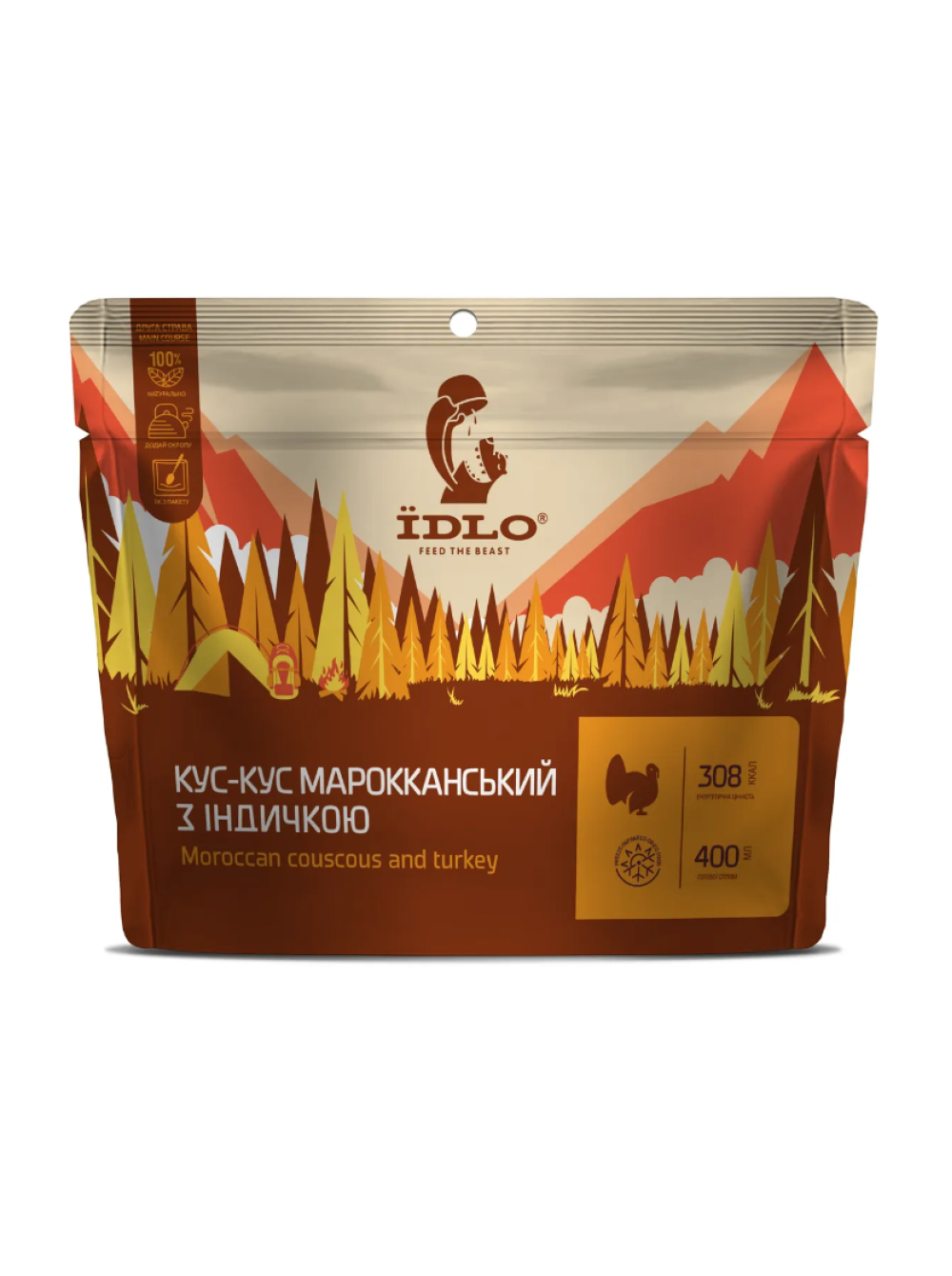 Склад: крупа кус-кус (70%), овочі тушковані сублімовані: цибуля, морква, перець солодкий, кабачок (13%), філе індиче варене сублімоване (11%), петрушка сушена, часник сушений, куркума, коріандр, чорний перець, сіль.