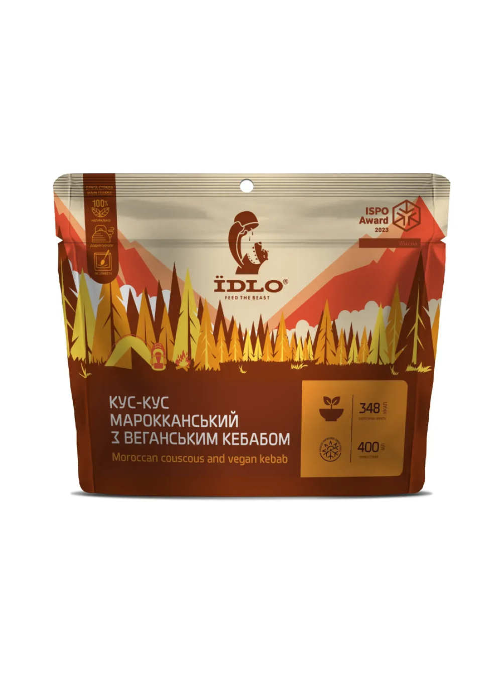 Склад: крупа кус-кус (73%), кебаб рослинний сублімований (13%)(ізолят соєвого білку, пшеничний білок, олія соняшникова, олія кокосова, екстракт дріжджів, крохмаль картопляний, волокна картопляні, прянощі, сіль), овочі тушковані сублімовані: цибуля, морква, перець солодкий, кабачок (11%), петрушка сушена, часник сушений, куркума, коріандр, чорний перець, сіль.