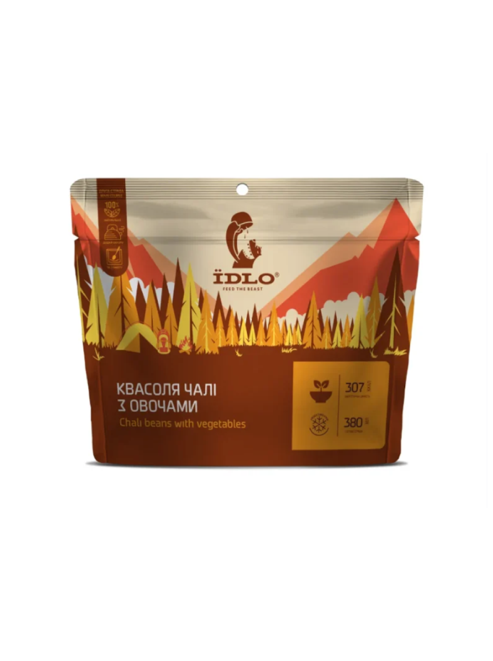 Склад: квасоля чалі варена сублімована, овочі тушені сублімовані (морква, цибуля), цибуля смажена сушена, томатні пластівці, сіль, перець чілі, цукор. Виготовлено методом сублімації готової страви.