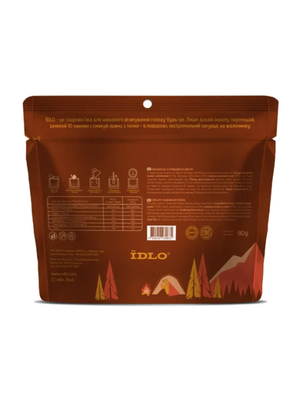 Склад: макарони варені сублімовані (70%), печериці сублімовані (16%), вершки рослинні сухі (10%), сир гауда сушений, базилік сублімований, сіль.