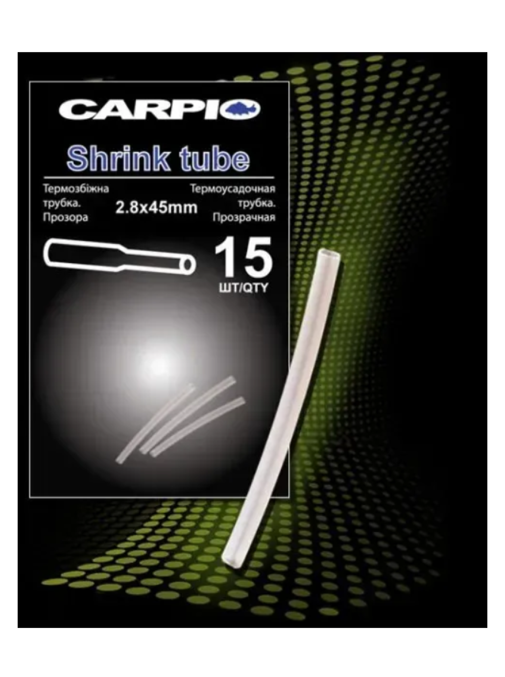 Цей виріб є одним зі складових карпового повідця. Трубка має розміри 2.8 мм. х 45 мм. Довжина в 45 мм. дозволяє використовувати пластикові коробки таких фірм як ФОКС і Неш, для зберігання таких трубочок. Після усадки трубки над парою, вона стає в міру жорсткою, що дозволяє їй виконувати покладені на неї функції (зміна форми гачка), але при цьому, під час навантажень, трубка не ламається і тривалий час зберігає свої властивості і виконує необхідні функції. Найчастіше термозбіжна трубка використовується, коли гачка необхідно надати іншу форму і тим самим збільшити здатність до зарубки. Саджати трубку рекомендуємо над парою від киплячої води. Трубка вмощується при температурі від 80 градусів. При саджання, діаметр зменшується в приблизно в 2,5 рази.