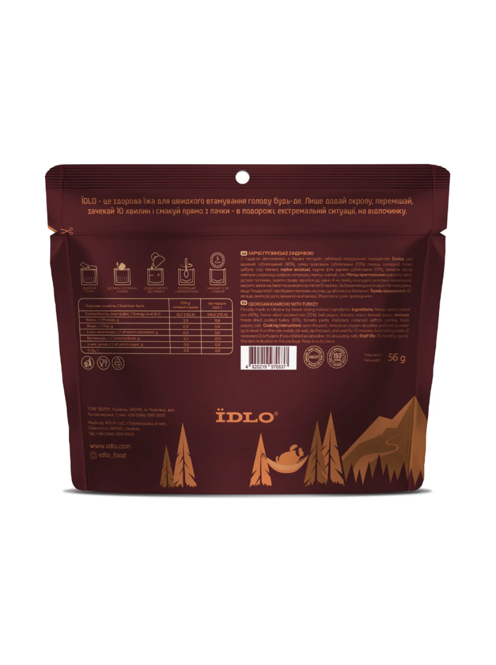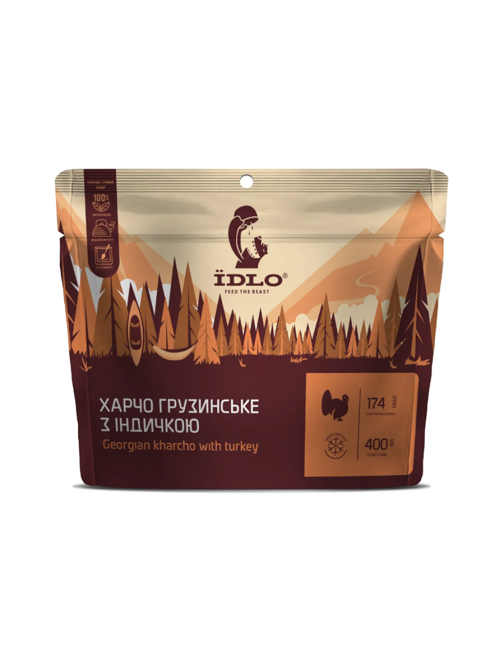 Поки кавказці з усіх усюд сперечаються, чия ж насправді ця страва, наш шеф-кухар створив справжній похідний шедевр! Адже коли ти голодний і виснажений, на першому місці для тебе буде смак, а не походження. І цей… тобі знадобиться трішки терпіння, інакше зіпсуєш момент. Отже, ти традиційно відкриваєш пакетик ЇDLO, заливаєш окроп і чекаєш 10 хвилин. Головне – не поспішай їсти, спокійно відкрий упаковку і вдихни аромат. Відчув?! Ну справді, зазвичай ти, перебуваючи хто-зна де, сподіваєшся отримати хто-зна що. Але аж ніяк не справжній харчо, немов щойно з плити. Шматочки індички, рис, овочі – це ще не все. Страва б не була справжньою без суто грузинської приправи хелі-сунелі. Тут є навіть волоський горіх. Навіщо? Не питай, куштуй, потім зрозумієш. Прекрасний смак страви гарантуємо, адже всі інгредієнти натуральні, а калорії реальні.
